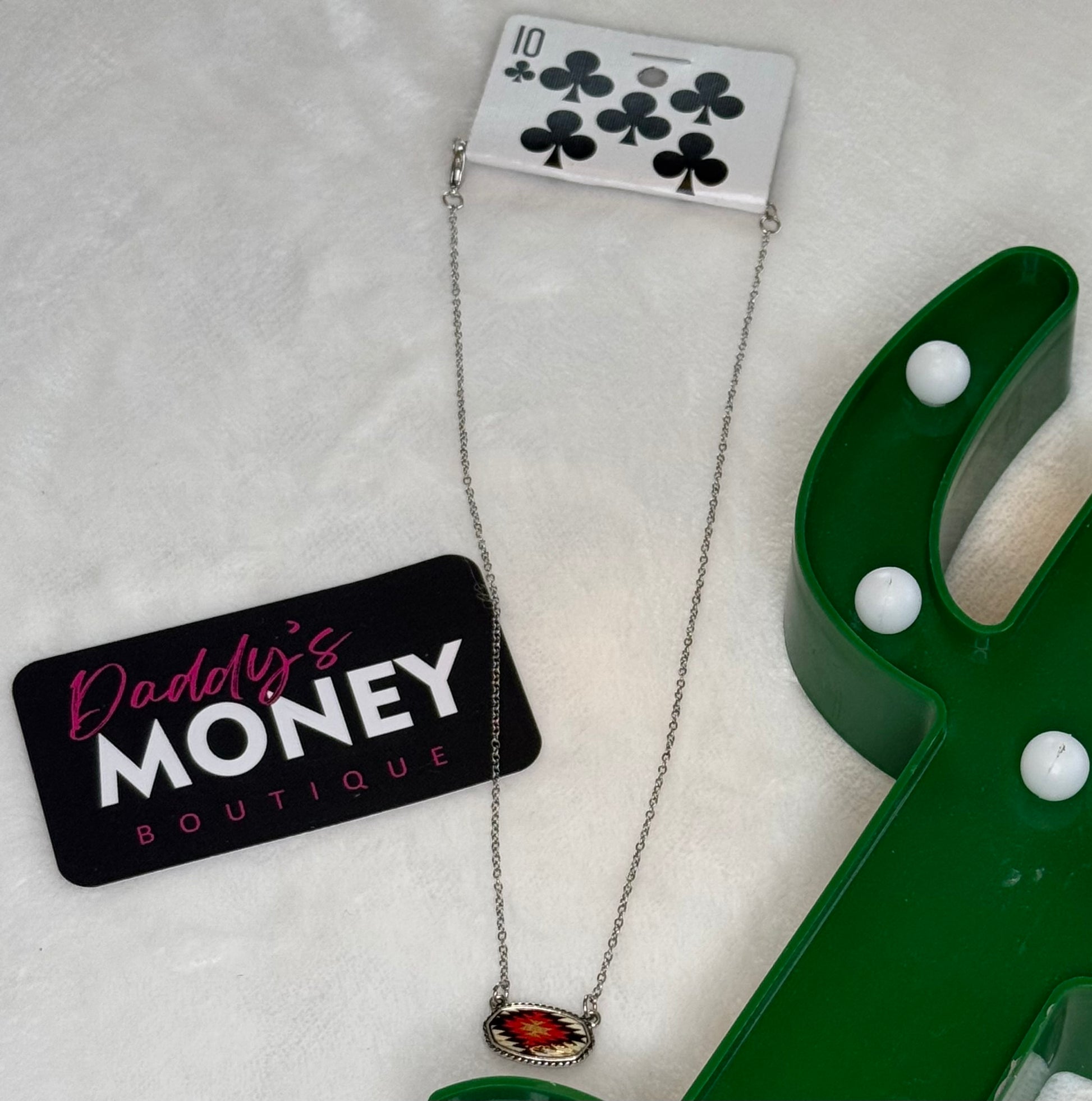 This classic Aztec Pattern Oval Necklace is the perfect way to add a touch of Western style to any look. Crafted from silver-tone metal, this 18" plus 3" necklace is accented with a bold aztec pattern and red accents for a boho flair.