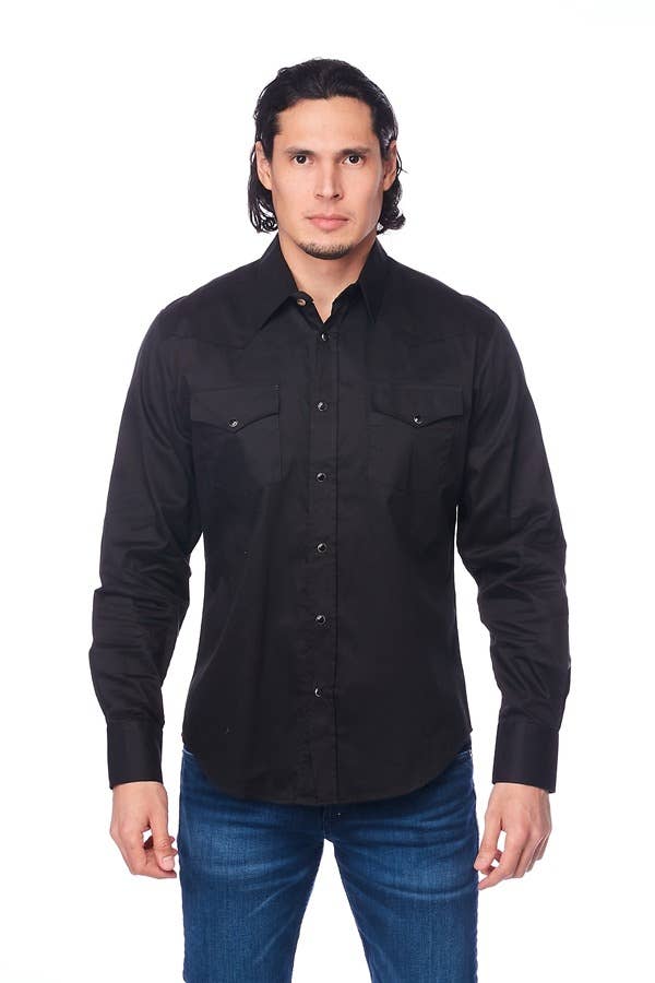 The Men's Solid Black Button Up features a classic design with a modern twist. This shirt is enhanced with pearl snap buttons, providing both style and functionality. Perfect for any occasion, this shirt offers a comfortable fit and effortless style.