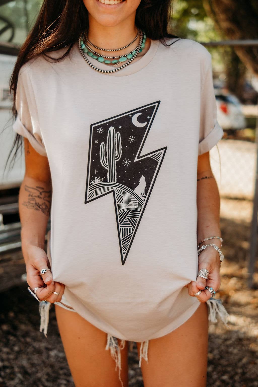 Cooler weather is coming but that doesn’t mean you can’t turn up the heat! This electrifying tee features a striking lightning bold graphic with a desert scene depicted on the inside. The design adds a touch of energy to your outfit.