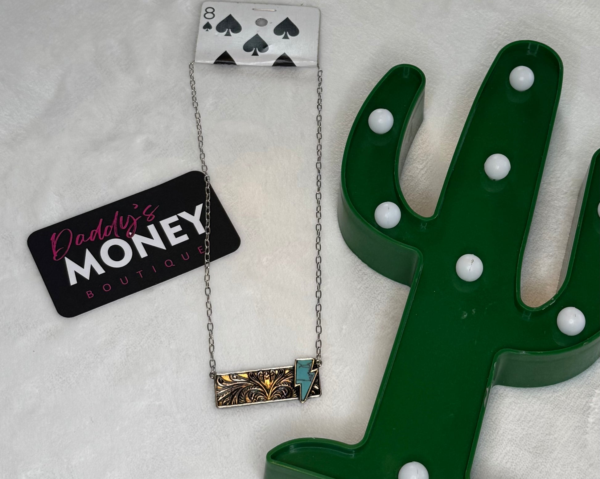 Glistening in burnished silver and a dreamy turquoise hue, the Lightning Bolt Bar Necklace adds an elegant touch to any style. Measuring at 18" with a 3" extender, this captivating accessory will complete any look with ease.