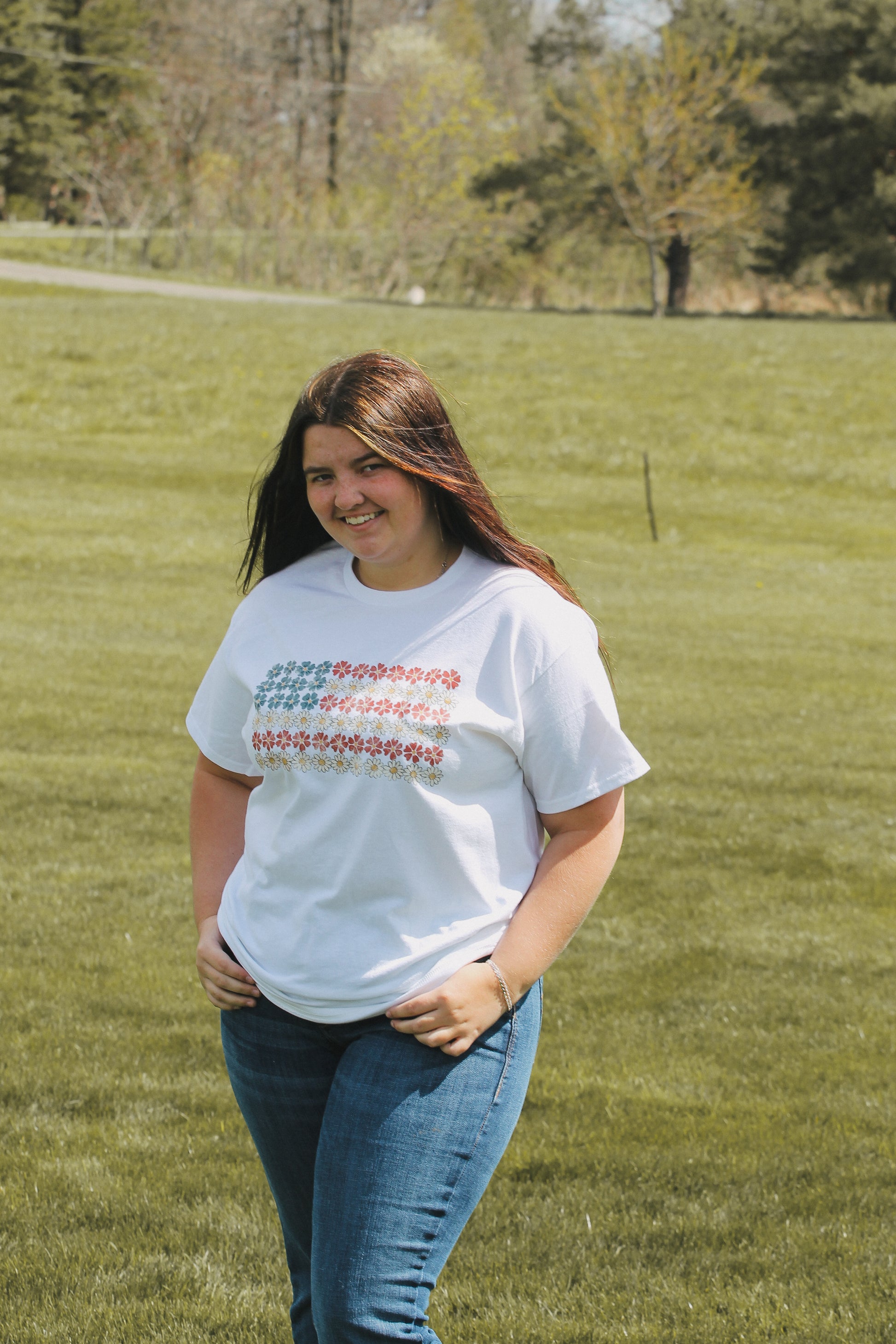 Show off your patriotism in style with our White Floral American Flag T-Shirt. This unique design features a delicate floral pattern, adding a touch of feminine charm to a classic symbol of American pride.