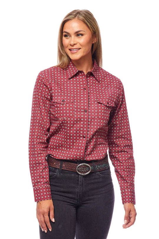 This Women's Red Printed Button Up is designed to fit your body perfectly and elevate your style. With pearl snap buttons, this top adds a touch of sophistication to any outfit. Its fitted design flatters your figure while keeping you comfortable all day long.