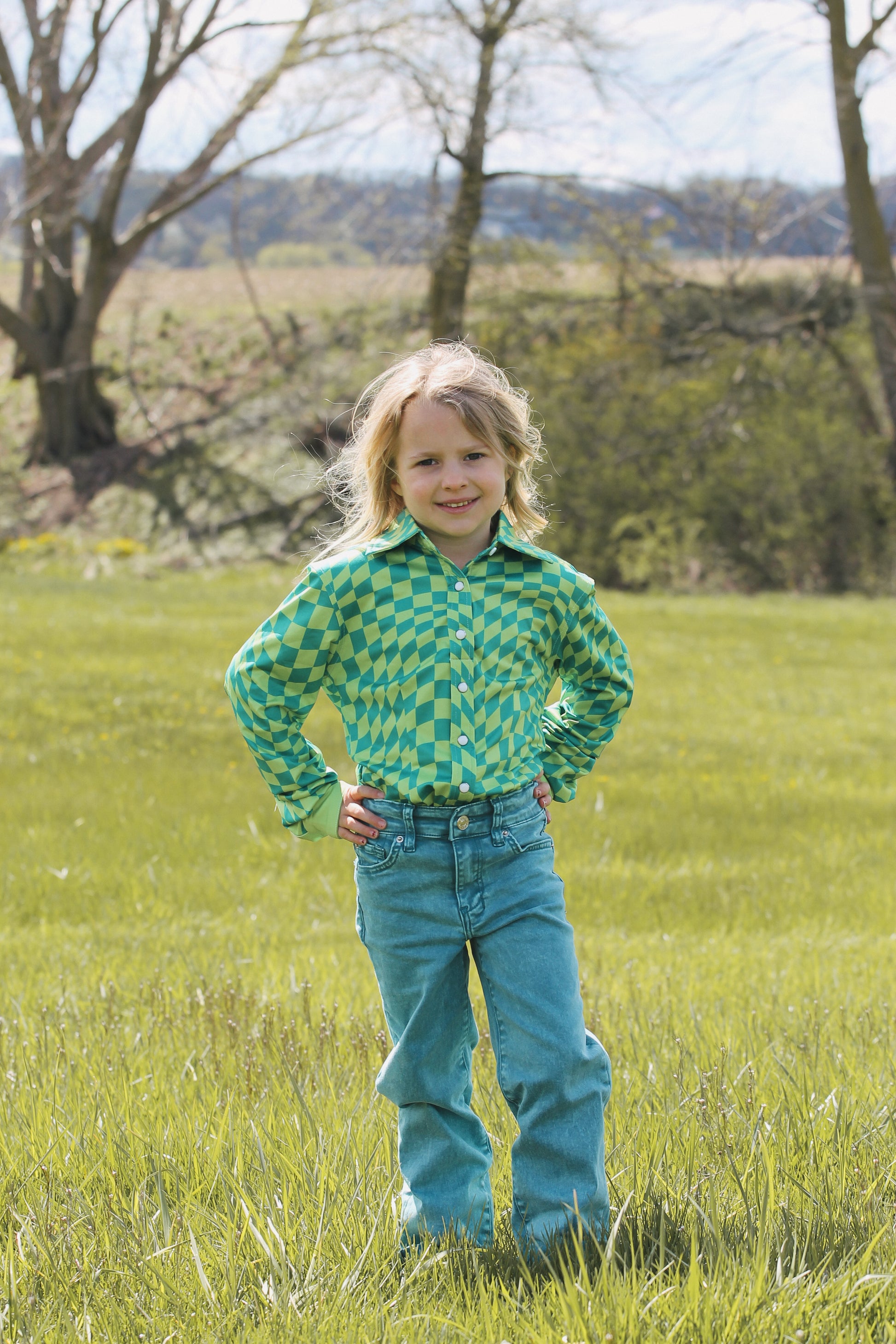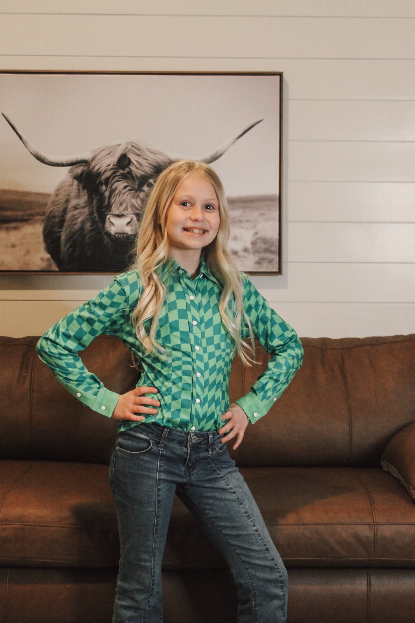 Grab this funky green checkered performance shirt for your little one - perfect for showing! Made with a lightweight poly spandex blend for ultimate comfort and performance. Features 3 functional top buttons and a versatile pullover style that won't wrinkle.